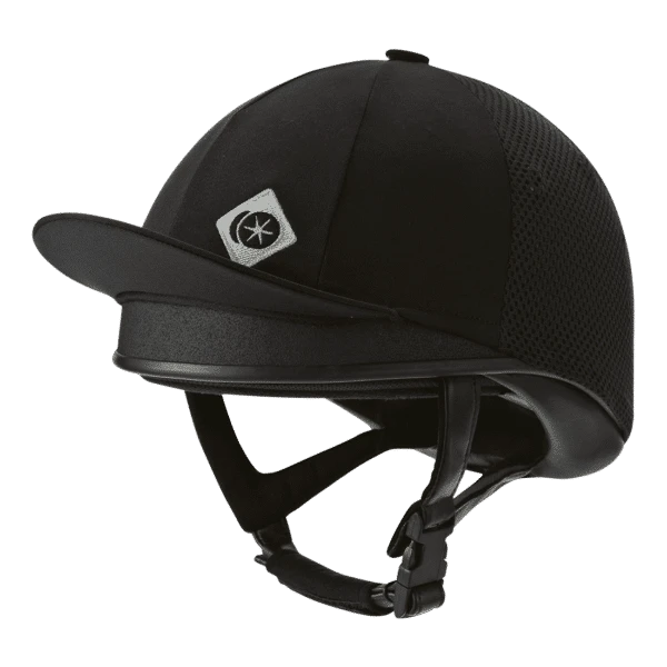 This low-profile helmet comes with a matte silk cover embroidered with the Charles Owen logo.