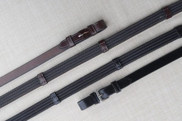 The 3/4″ Red Barn Special Grip Rein combines both web and exterior strips of rubber, with stops, for added stay. A best-seller. Black Buckle with Stops.Â