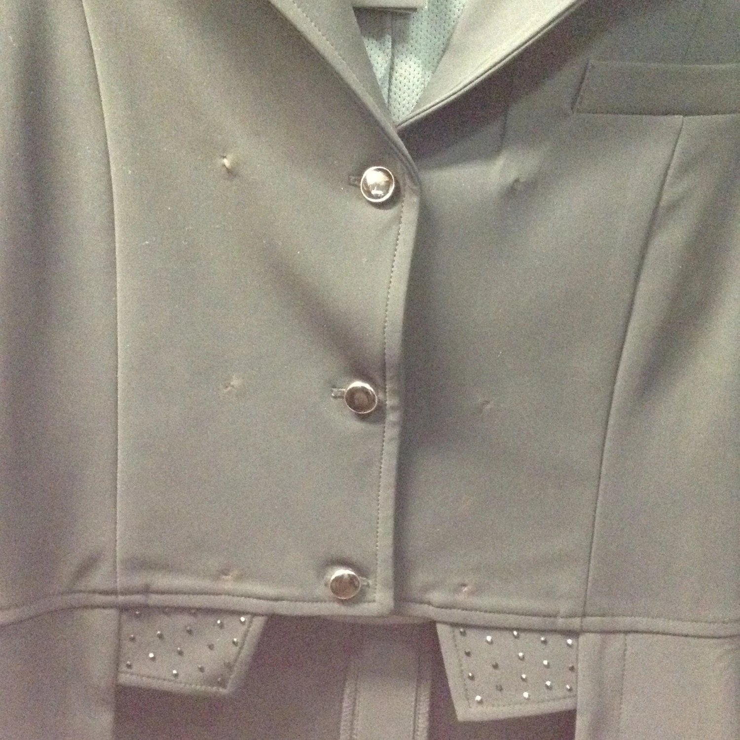A beautiful high functional long tail coat. The long tail coat has crystals on the collar. The crystals are matching the fabric on the lower front. Double row black logo buttons makes sure it fits your body perfectly.Â