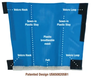 Breathable plastic mesh with sewn-in stays to eliminate sagging. Heavy-duty Velcro ensures durability and wear-ability. Lower edge finished in felt to eliminate embedded wild oats, burrs, and foxtails.